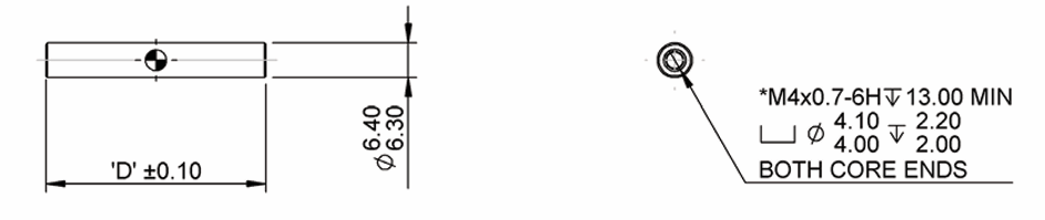 | A = 엔드 플레이트를 포함한 본체 길이 B = 중간 보정/null 위치의 캐리어 돌출부 C = 중간 보정/null 위치에서 캐리어의 Null 포인트 투 엔드 D = 코어 길이 E = 보어 깊이 * = 24.00mm보다 짧은 코어는 나사산으로 관통 |
