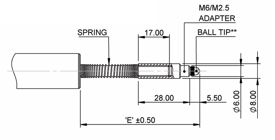 E = 중간 보정/null 위치의 캐리어 돌출부 어댑터와 볼 팁이 장착된 상태 F = 중간의 유니버설 조인트 중심으로부터의 거리 보정/null 위치 * = 구성 요소가 완전히 나사로 고정된 위치 ** = 기타 팁 변형 제공 |