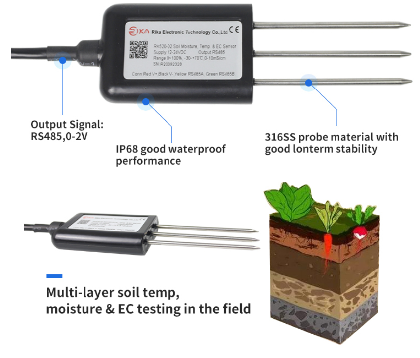 RK520-02 토양 수분.온도.전기전도도(EC) 센서는 수분, 온도 및 EC 측정 기능을 하나의 장치에 통합한 센서입니다.